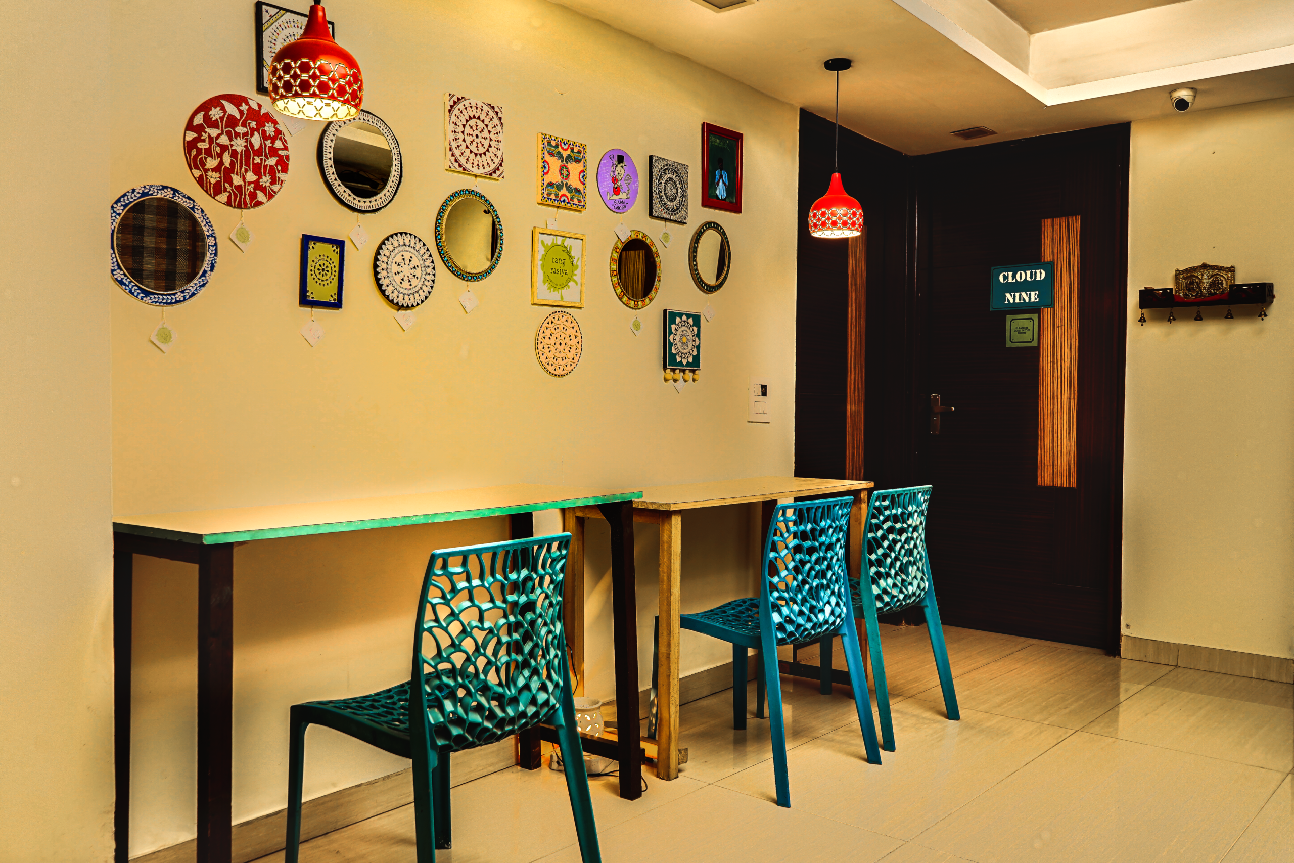 Our rooftop terrace offers stunning views of Delhi’s skyline, perfect for unwinding after a busy day. With comfy seating, chilled vibes, and sunsets to die for, it’s a great spot to relax!